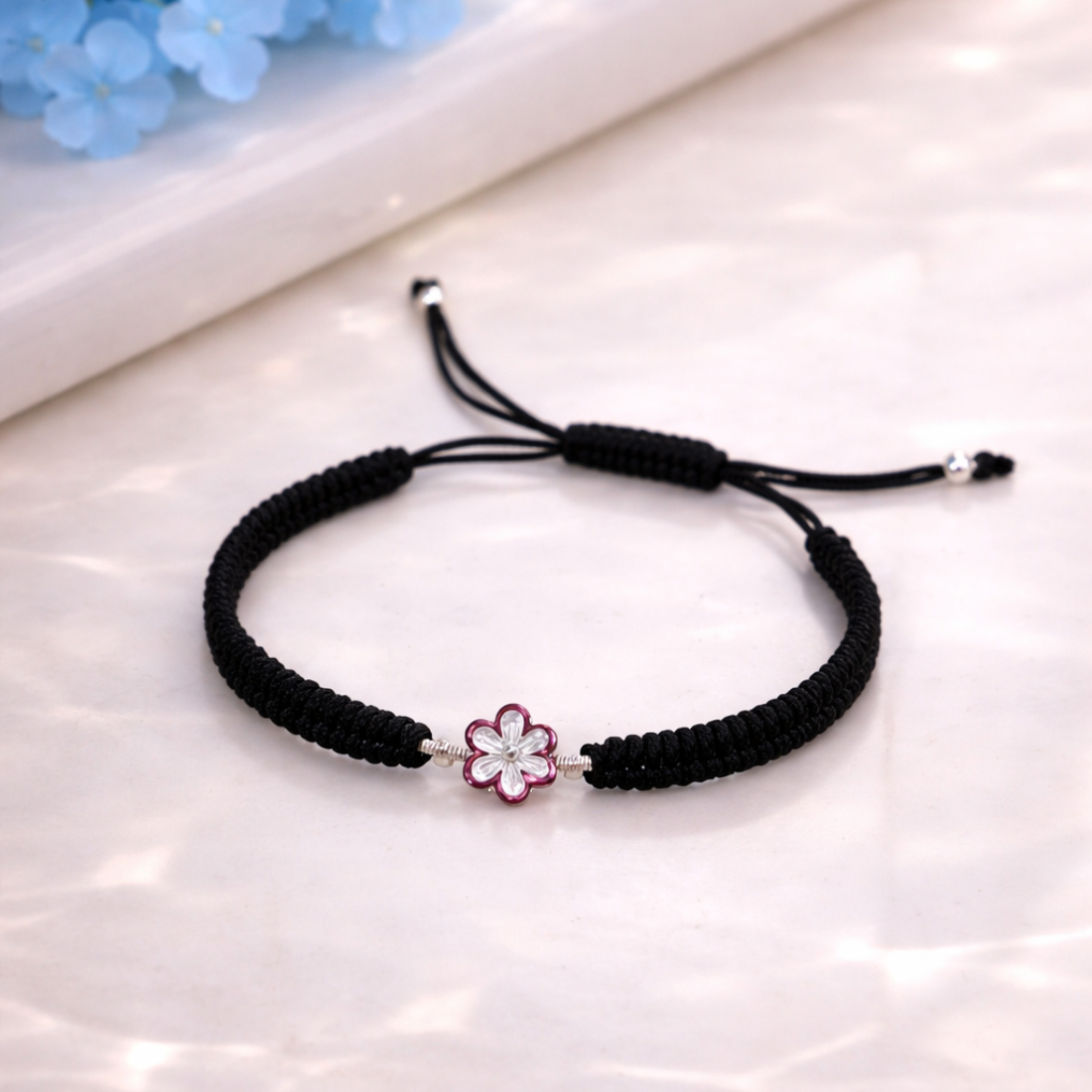 Embrace effortless elegance with this exquisite hand-woven cord bracelet, featuring a delicate floral centerpiece designed to add a touch of nature-inspired beauty to your everyday style. The focal point is a beautifully crafted six-petal flower charm, boasting a shimmering silver finish with vibrant pink accents that catch the light from every angle. Meticulously constructed using durable, high-quality black nylon cord in a sophisticated macramé weave, this piece offers both resilience and comfort. Its practical adjustable sliding knot closure ensures a perfect, customized fit for any wrist size, while the subtle silver beads at the ends provide a refined finishing touch. Whether worn as a solo statement piece or layered with your favorite bangles, this versatile accessory is the perfect blend of bohemian charm and modern minimalist design.