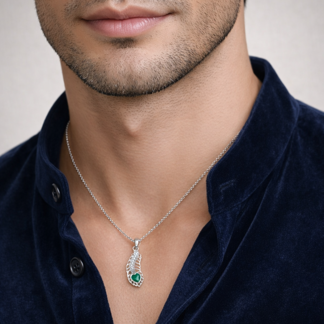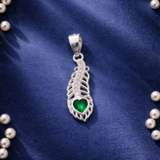 Exude grace and charm with this stunning Sterling Silver pendant, featuring an intricately detailed peacock feather design that curves into a delicate silhouette. At its center lies a brilliant, heart-shaped emerald-green stone, beautifully framed by a shimmering row of pavé-set crystals that add a touch of luxury and light. The pendant hangs from a high-quality, polished cable chain, making it a perfect accessory for both casual elegance and special occasions. Symbolizing beauty and renewal, this lightweight and durable piece is a timeless addition to any jewelry box or a heartfelt gift for a loved one who appreciates nature-inspired artistry.