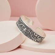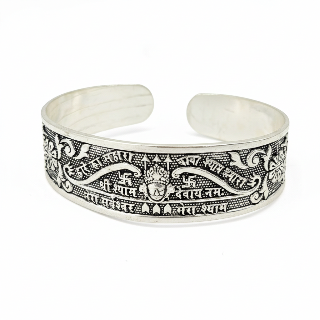 Embrace spiritual elegance with this exquisitely crafted Khatu Shyam Ji Oxidized Silver Kada, a perfect blend of faith and contemporary style. Meticulously designed with high-quality oxidized silver finish, this adjustable cuff bracelet features intricate embossed detailing of the sacred "Haare Ka Sahara" mantra and divine symbols dedicated to Lord Shyam. The central motif showcases the revered likeness of Khatu Shyam Ji, flanked by elegant floral engravings and traditional patterns that give it a vintage, soulful appeal. Lightweight yet durable, this kada is designed for both men and women, offering a comfortable fit for daily wear or special religious occasions. Whether you are seeking a meaningful gift for a loved one or a personal talisman of protection and peace, this devotional accessory serves as a constant reminder of divine grace and strength.
