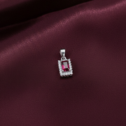 Elevate your jewelry collection with this exquisite pendant, featuring a captivating emerald-cut ruby that radiates a deep, passionate crimson hue. The central gemstone is elegantly framed by a shimmering halo of brilliant-cut accents, meticulously set to enhance the stone's natural fire and sophisticated geometric silhouette. Suspended from a delicate sterling silver cable chain, this timeless piece offers a seamless blend of classic luxury and modern minimalism. Whether worn as a bold statement for special occasions or a touch of refined glamour for everyday wear, this necklace is designed to catch the light and command attention with every movement.