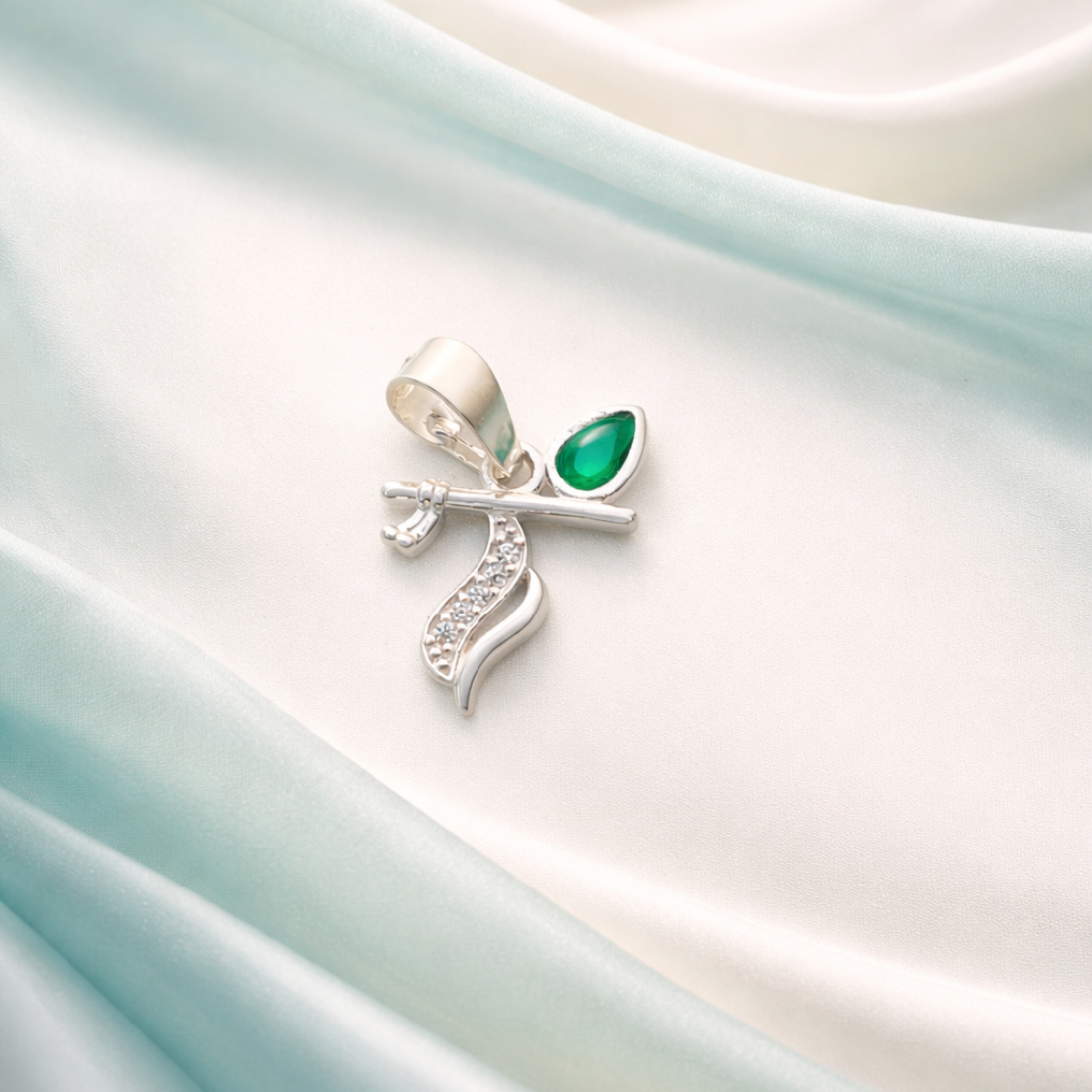 Embrace spiritual elegance with this beautifully crafted DSA Silver Krishna-inspired necklace, featuring a minimalist fusion of the divine Bansuri (flute) and a graceful peacock feather. The pendant is highlighted by a vibrant, pear-cut green gemstone and a delicate trail of shimmering pavé crystals, offering a sophisticated sparkle that catches the light from every angle. Suspended from a durable, high-polish cable chain, this lightweight piece is designed for comfortable daily wear while serving as a meaningful symbol of peace and devotion. Whether styled as a personal talisman or given as a thoughtful gift, its timeless design and polished finish ensure it remains a versatile staple in any jewelry collection.