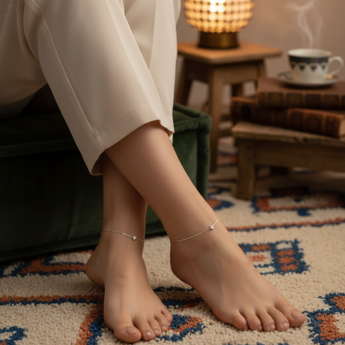 This elegant anklet features a delicate sterling silver chain, providing a minimalist and graceful look around the ankle. A single, brilliant-cut cubic zirconia or diamond stone, set in a simple bezel or claw setting, acts as the central focal point, adding a subtle sparkle and touch of sophistication to the piece, perfect for everyday wear or dressing up an evening ensemble.