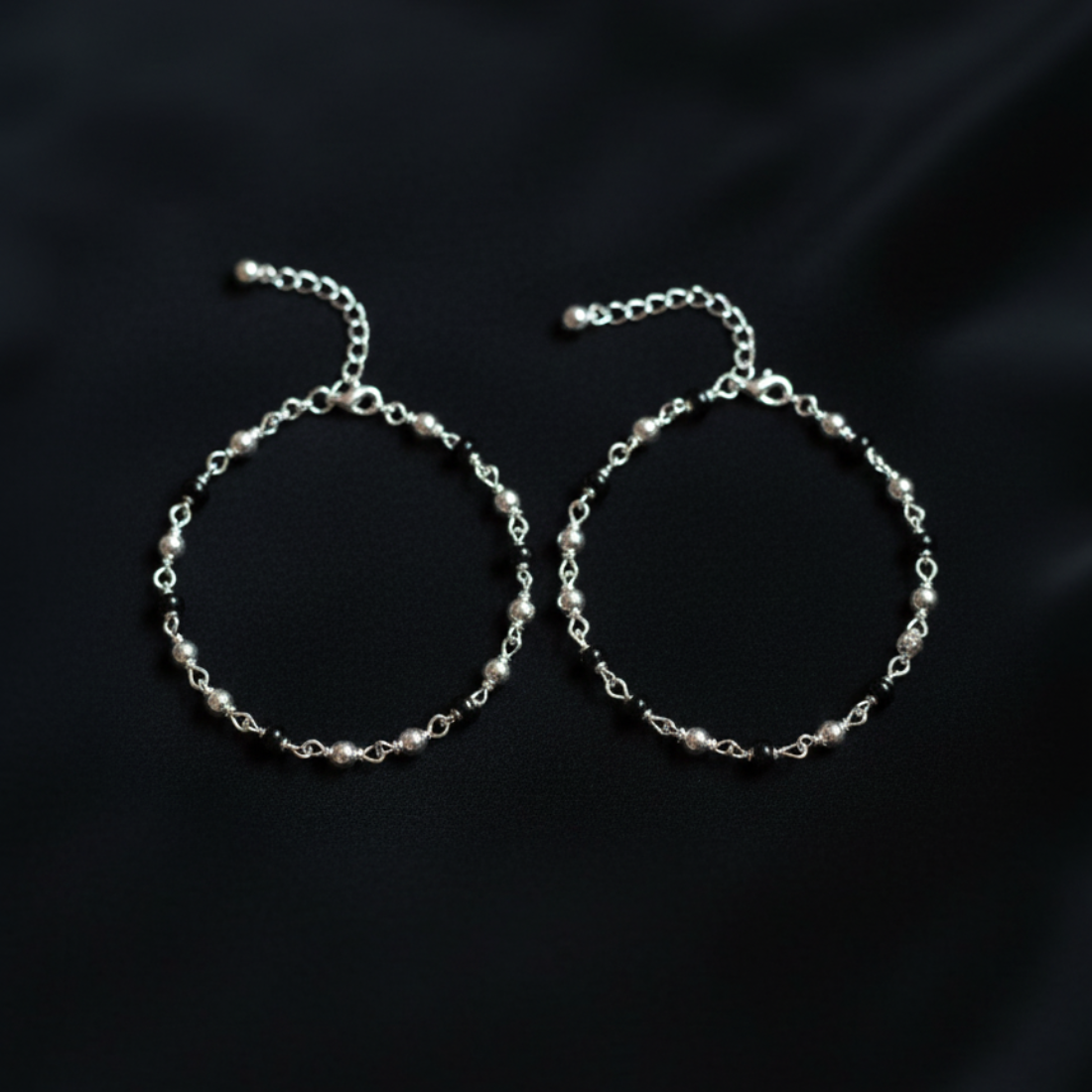 These charming baby bracelets offer a delicate and traditional touch for your little one. Crafted with a fine silver chain, each bracelet features a continuous sequence of tiny, smooth silver beads interspersed with a few contrasting black beads. This classic combination of silver and black is often chosen for its traditional significance, believed by many to offer protection and ward off the evil eye. The bracelets are designed with safety and adjustability in mind, featuring a small, secure clasp and an extender chain ending in a small silver bead, allowing them to grow with your baby