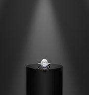 Dazzling Oval Diamond Halo Engagement Ring on a Black Pedestal