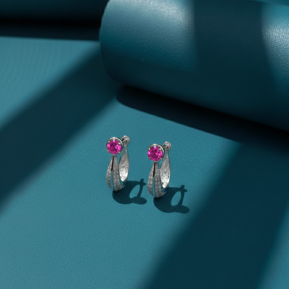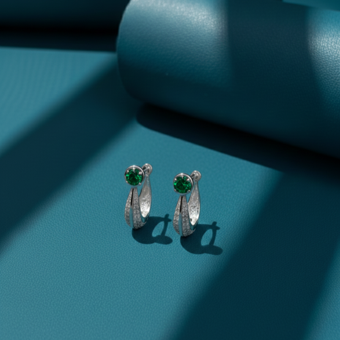 These exquisite earrings feature a modern, split-hoop design crafted from SILVER 92.5 and richly accented with delicate micro-pavé detailing along the curved edges for exceptional sparkle. The centerpiece of each earring is a brilliant, round-cut stone, carefully mounted to maximize its radiance, creating a captivating focal point that illuminates the wearer's face. The sophisticated silhouette provides a stylish twist on the classic hoop, offering a look that is both timelessly elegant and contemporary chic, making them perfect for elevating any outfit from daytime wear to evening glamour.