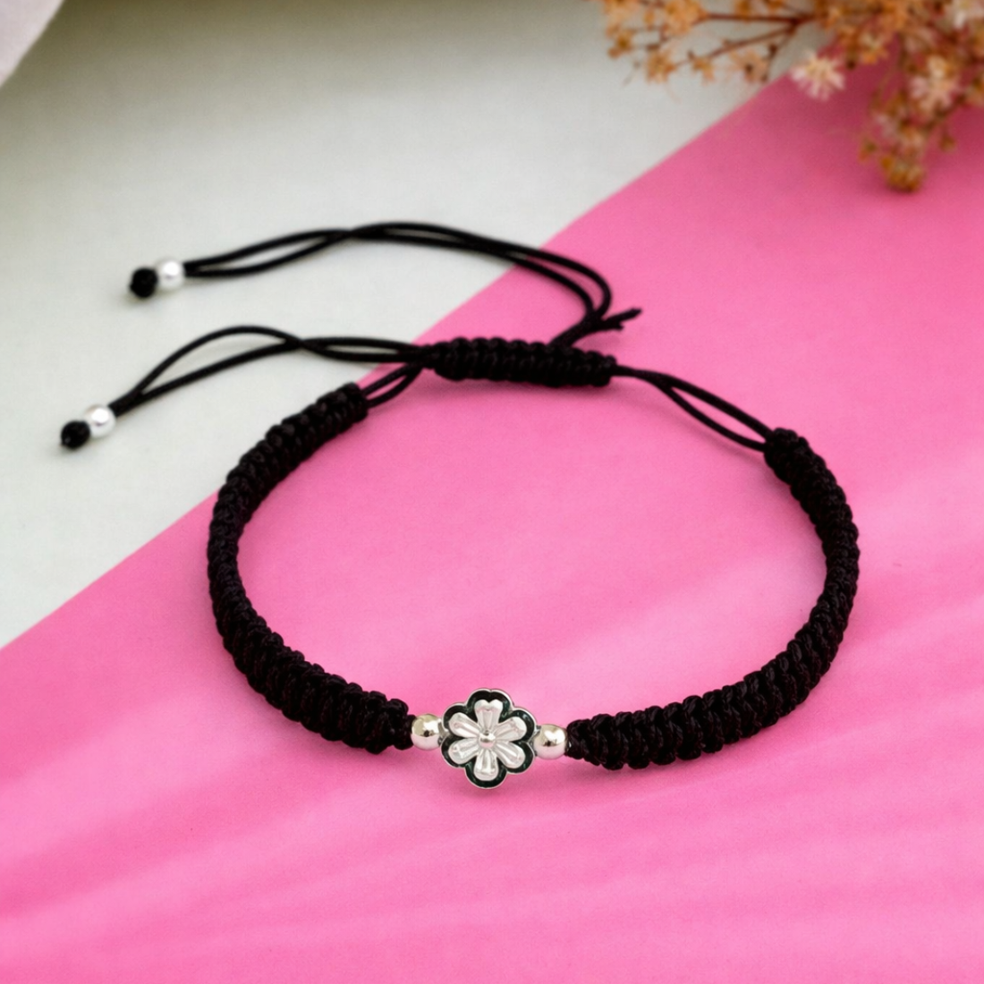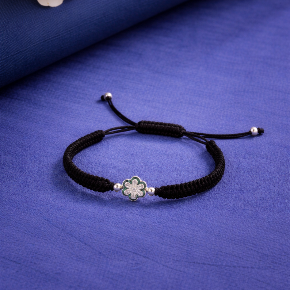 Elevate your everyday style with this exquisite handcrafted bracelet, featuring a delicate silver-toned floral charm at its center. The intricate flower motif is accented with subtle green enamel detailing and framed by shimmering metallic beads for a touch of refined elegance. Woven with a durable, high-quality black cord in a sophisticated braided texture, this piece offers both comfort and resilience. Designed with a versatile sliding knot closure, it provides an adjustable fit for any wrist size, making it a perfect gift or a timeless addition to your own jewelry collection.