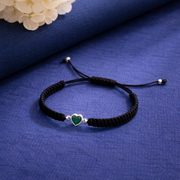 Embrace a touch of artisan charm with this beautifully Handcrafted Black Cord Green Heart Bracelet. At the center of this piece sits a faceted, emerald-green heart stone encased in a delicate silver-tone scalloped bezel, offering a sophisticated pop of color against the rugged texture of the hand-braided black macramé cord. Designed for both durability and style, the adjustable pull-string closure provides a customized and secure fit for any wrist size, while the polished silver-tone end beads add a refined finishing touch. Whether gifted to a loved one as a symbol of affection or worn as a personal statement of elegance, this versatile bracelet seamlessly transitions from casual daytime wear to an evening accessory.