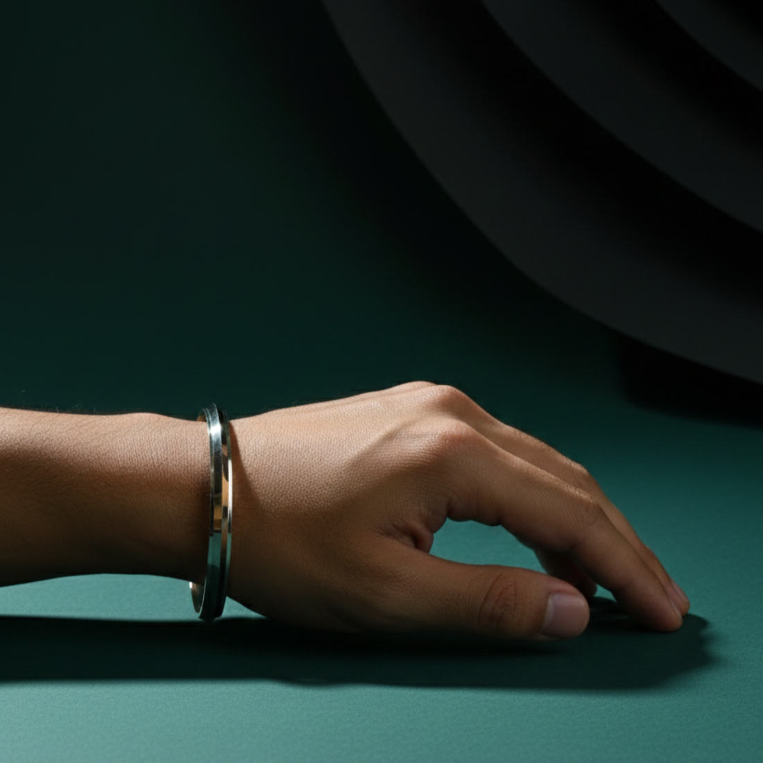This exquisite sterling silver Kada is a perfect blend of timeless tradition and sleek, modern design, ready to elevate any jewelry collection. Crafted from high-quality Sterling Silver and featuring a high-polish, mirror-like finish, this bangle offers exceptional durability and a brilliant, lasting shine. The defining characteristic is its striking flat-edge profile, which beautifully catches and reflects light, giving the piece a luminous and bold geometric presence on the wrist. Its clean lines and sophisticated, versatile aesthetic make it ideal for both men and women, fitting seamlessly with traditional Indian attire as well as contemporary, Western fashion. This Kada is an impactful, high-shine accessory designed for continuous, comfortable wear.