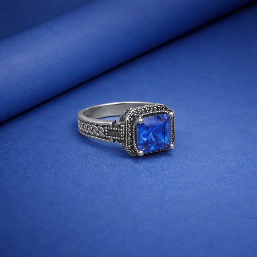 Exude timeless elegance with this masterfully crafted statement ring, featuring a vibrant blue sapphire-style center stone in a brilliant square...