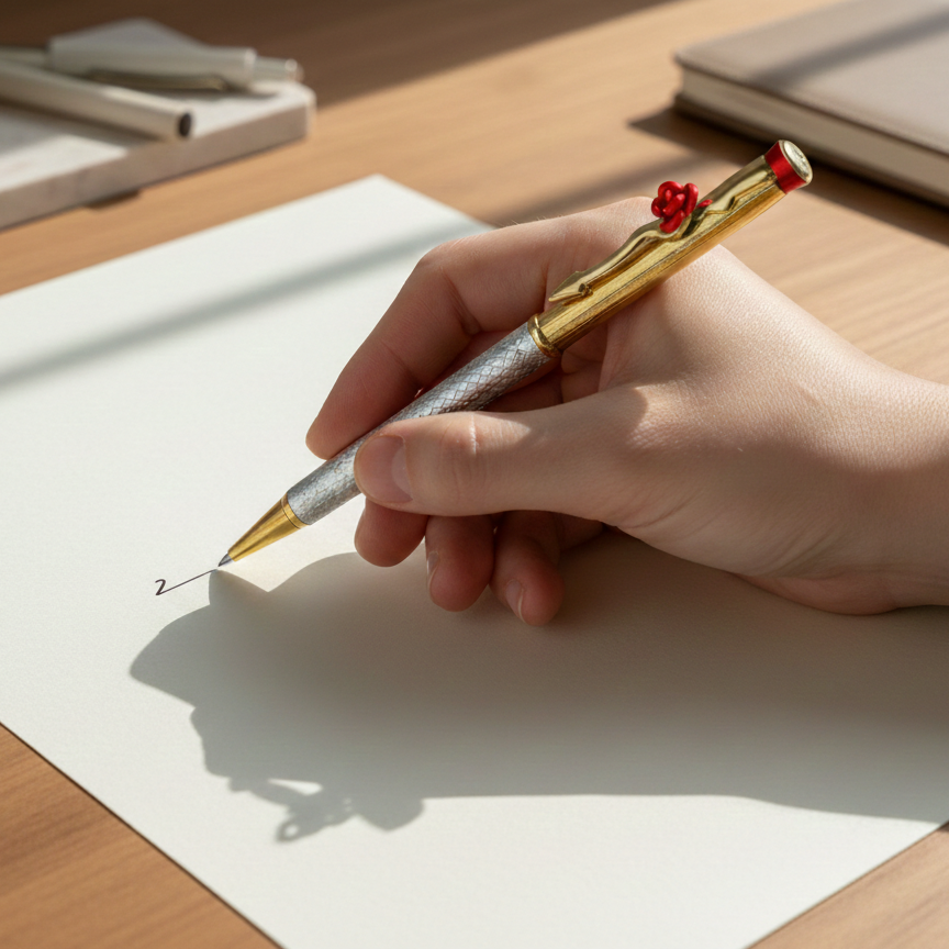 Elevate the art of writing with this exquisite dual-tone executive pen, a perfect blend of romance and sophisticated craftsmanship. The upper barrel features a brilliant gold-polished finish, uniquely sculpted with organic vine-like contours and adorned with a striking, vibrant red rose in full bloom. This is beautifully contrasted by a shimmering silver-toned lower barrel, intricately embossed with a diamond-cut honeycomb texture that ensures a comfortable, non-slip grip. Finished with a sleek tapered gold tip, this statement writing instrument transforms a daily essential into a luxurious accessory, making it an unforgettable gift for special occasions or a refined addition to any professional stationery collection.